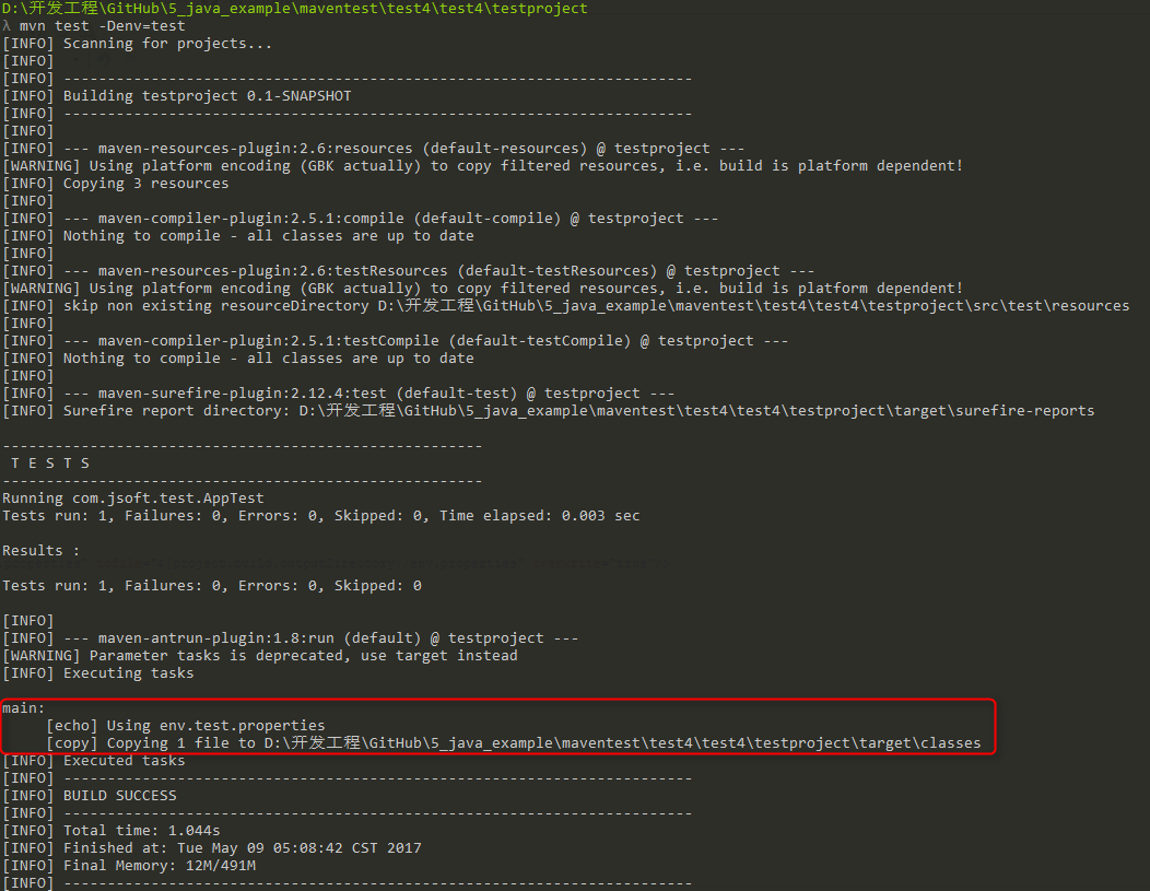 可以看出成功的触发了AntRun的任务。并且是对应构建配置文件下的 <id> 为 test 的任务。