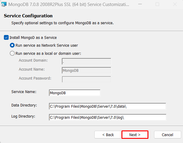 现在,出现了两个选择:您可以以网络服务用户身份运行 MongoDB,也可以以本地或域用户身份运行它。