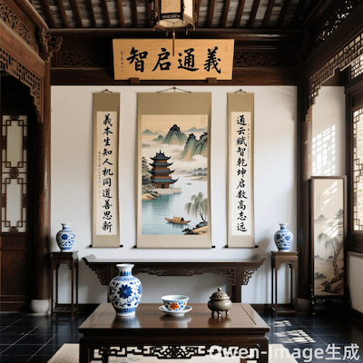 prompt = "一副典雅庄重的对联悬挂于厅堂之中,房间是个安静古典的中式布置,桌子上放着一些青花瓷,对联上左书"义本生知人机同道善思新",右书"通云赋智乾坤启数高志远", 横批"智启通义",字体飘逸,中间挂在一着一副中国风的画作,内容是岳阳楼。"
