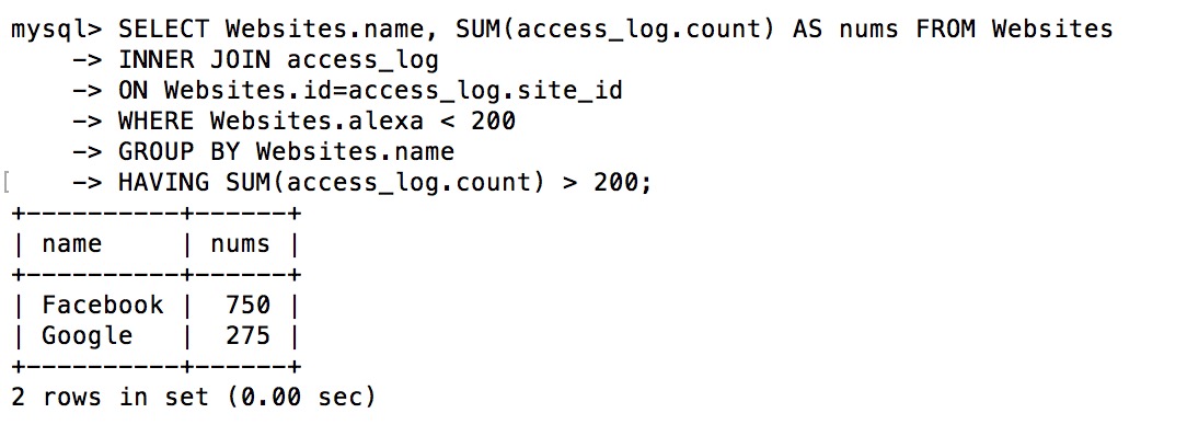 mysql> SELECT * FROM access_log; +-----+---------+-------+------------+ | aid | site_id | count | date | +-----+---------+-------+------------+ | 1 | 1 | 45 | 2016-05-10 | | 2 | 3 | 100 | 2016-05-13 | | 3 | 1 | 230 | 2016-05-14 | | 4 | 2 | 10 | 2016-05-14 | | 5 | 5 | 205 | 2016-05-14 | | 6 | 4 | 13 | 2016-05-15 | | 7 | 3 | 220 | 2016-05-15 | | 8 | 5 | 545 | 2016-05-16 | | 9 | 3 | 201 | 2016-05-17 | +-----+---------+-------+------------+ 9 rows in set (0.00 sec)