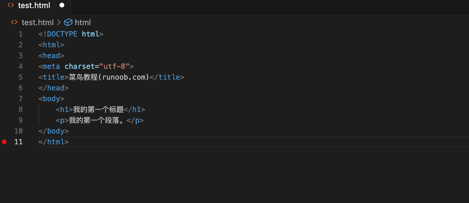 RUNOOB-TEST文件夹:当前工作区的项目文件夹。test.html文件:当前正在编辑的 HTML 文件。