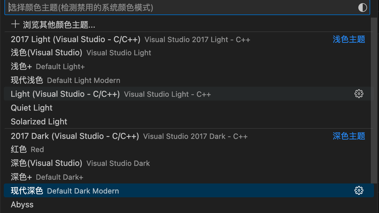 从菜单栏选择 Code > 设置(首选项) > 主题 > 颜色主题 菜单项:或使用命令 Preferences: Color Theme (⌘K ⌘T) 打开主题选择器。