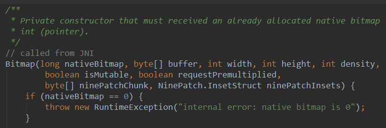 如果你打开Bitmap类的源码,你会看到Bitmap的构造方法上有这样一段东东: