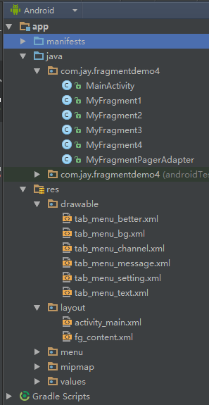 PS:我们是在实现底部导航栏方法2的基础上来写的,所以资源文件照搬即可! 这里就不贴多次了~!