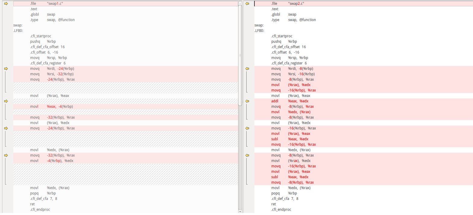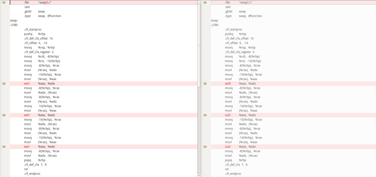 最后附上两张三种方法编译后对应汇编代码对比图(平台:Ubuntu14.04,gcc 4.8.4),图中 swap1.c 文件对应临时变量法,swap2.c 文件对应加减方法,swap3.c 文件对应异或方法。可以看到,临时变量法编译出的汇编代码量最少即效率更高,加减法和异或方法的区别仅仅是计算方式不同而已,操作步骤是一致的。