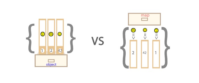 - Map 中的键值是有序的(FIFO 原则),而添加到对象中的键则不是。