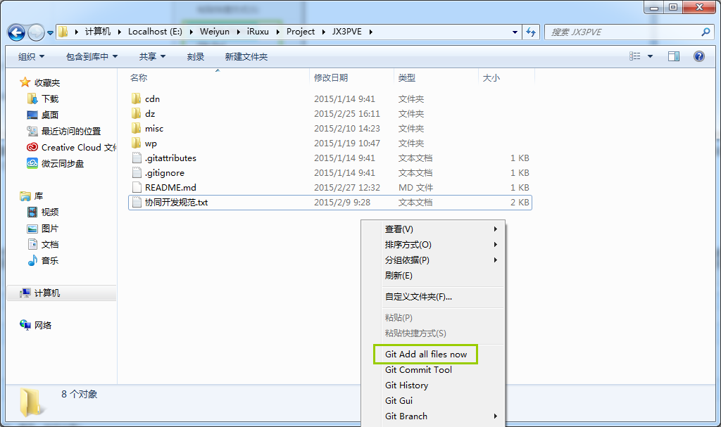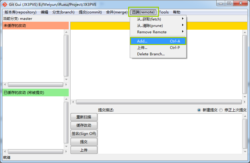 添加并不是提交代码到远程Git库,Git也并不会你修改了代码它自动帮你保存你修改的每一个过程。你修改了很多文件,但未必所有的修改,最终打算提交上去,那么哪些是你打算提交的,你可以添加进来待会提交,叫做缓存改动。很简单,比如本地电脑上我有整个项目完整的东东,甚至包含了账号密码的一些文件,但是我只是ADD除账号密码之外的文件,并不缓存账号密码文件的改动。不被ADD它就不会参与后续的操作。通常我都会直接全部缓存,它会自动寻找所有有改动的文件,而不需要提交的文件放在忽略的文件夹中。(关于忽略下面我们就会说到)