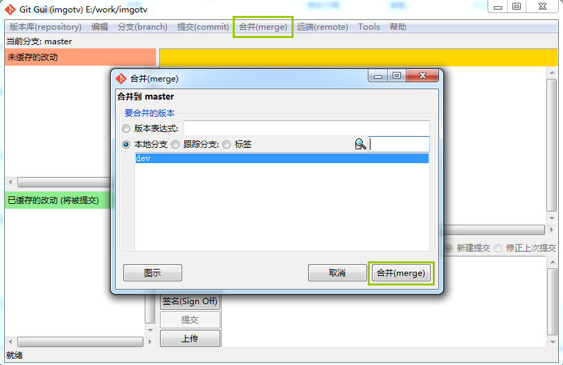 选择合并 - 本地合并,然后选择本地的分支(如果你没有创建分支,则只有1个主支master)