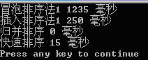 在本人电脑上对冒泡排序,直接插入排序,归并排序及直接使用系统的 qsort() 进行比较(均在 Release 版本下)。