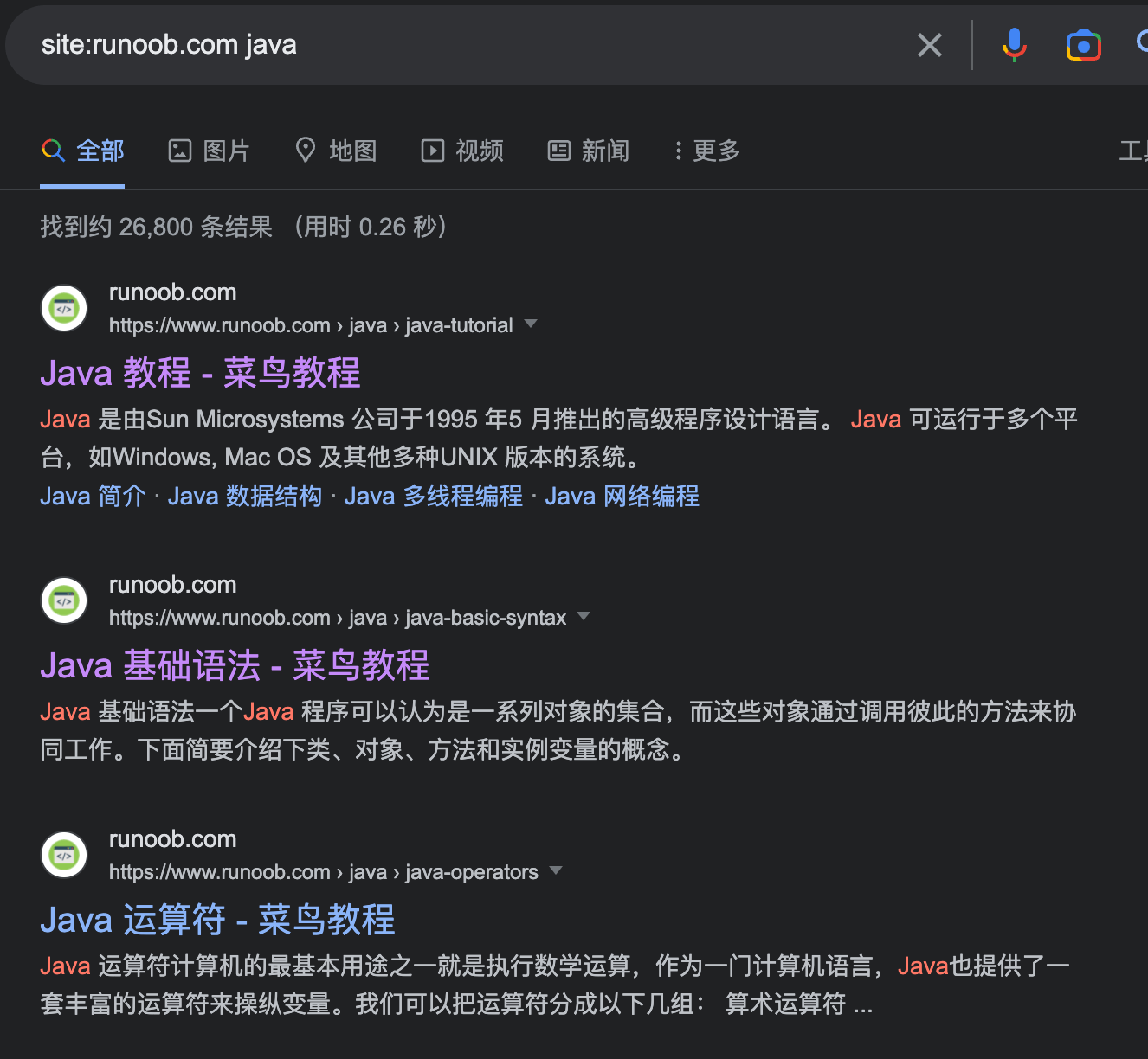 例如,我们搜索"site:runoob.com java"将返回所有在菜鸟教程上与"java"有关的结果。