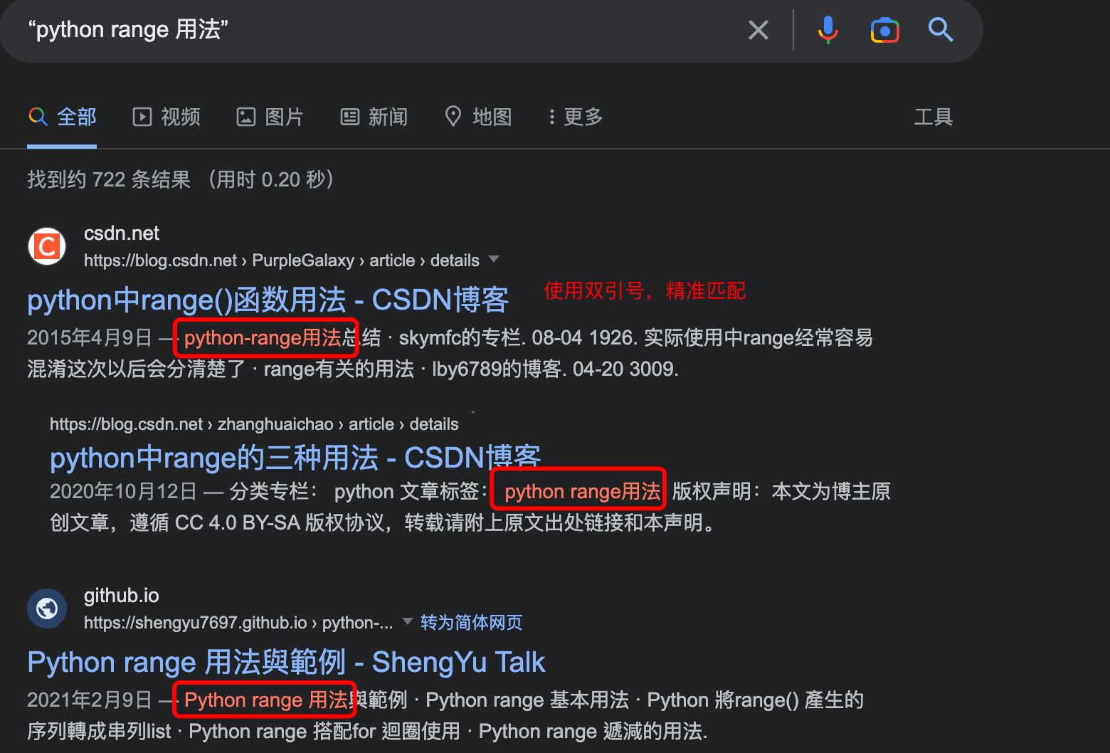 例如,我们搜索 "python range 用法",通过结果可以看出使用双引号和不使用双引号结果是不一样的。