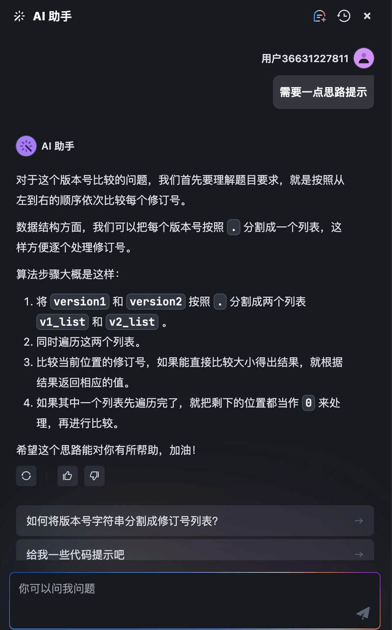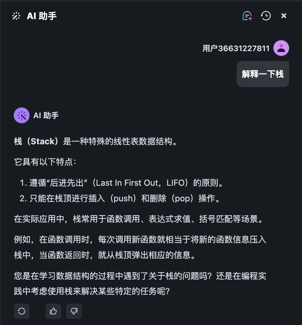 答题过程中,若需要 AI 助手的帮助,可点击右侧边栏顶部的 AI 按钮,打开 AI 助手聊天框,然后点击相应的按钮,获取思路提示和代码提示或让 AI 助手检查你所输入的代码。
