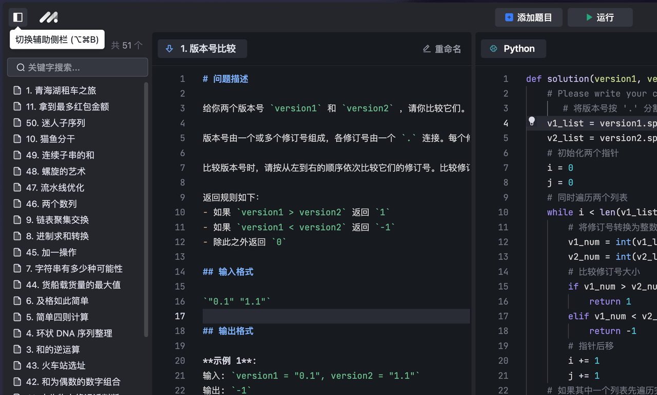 打开内置题目或添加自定义题目后,在题目面板右侧的代码编辑区域输入代码,解答题目。