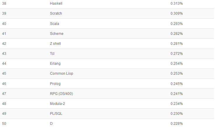 由于后 50 名编程语言之间差异比较小,所以这里只列出编程语言名称(排名不分先后)。