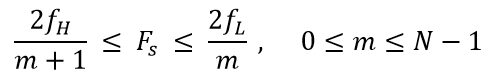 例如一个带宽信号中心频率为 60MHz,带宽为 8MHz, 则频率范围为 56MHz ~ 64MHz,m 的可取值范围为 0 ~ 7。取 m=1, 则采样频率范围为 64MHz ~ 112MHz。
