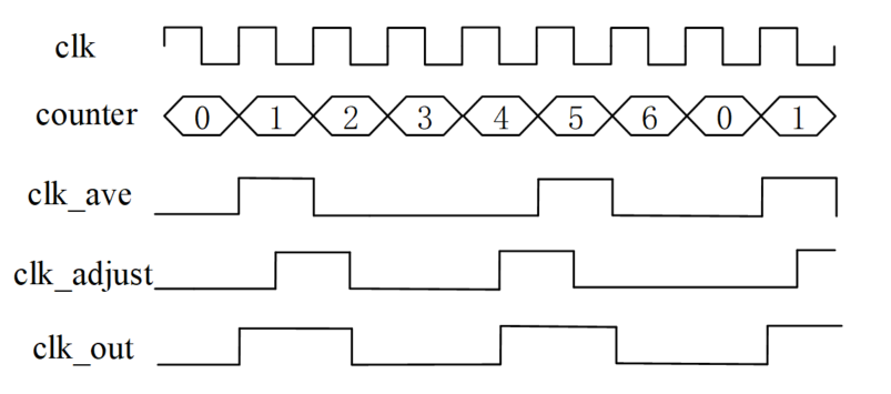 - (2) 下面对周期不均匀的分频时钟进行调整。一次循环计数中,在源时钟下降沿分别产生由 4 个和 3 个源时钟周期组成的 2 个分频时钟。相对于第一次产生的 2 个周期不均匀的时钟,本次产生的 2 个时钟相位一个延迟半个源时钟周期,一个提前半个源时钟周期。