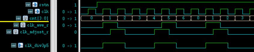 - (3) 将两次产生的时钟进行"或操作",便可以得到周期均匀的 3.5 倍分频时钟。分频波形示意图如下所示。