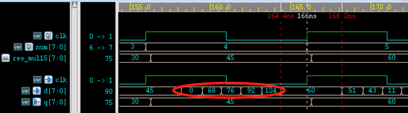 - (4) 图中红色部分是信号 d 变化的中间过程,因为信号各 bit 延迟不同,所以中间可能会出现多个不同的结果。