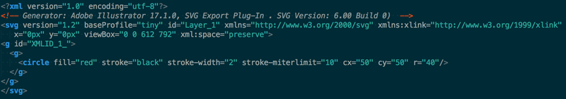 这个圆形轮廓为黑色,背景为红色,从Adobe Illustrator直接导出。可以从中看到大量元数据,例如图层信息、注释和XML名称空间等等,在浏览器中呈现资源时,通常不需要这些数据。因此我们需要使用一些工具去除这些不必要的元数据,仅保留必须的标记。