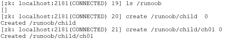 $ ls /runoob $ create /runoob/child 0 $ create /runoob/child/ch01 0